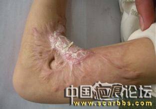 臨床特征:主要因深三度燒傷引起,疤痕深而厚,范圍較大,質(zhì)地硬,血液循環(huán)差,疤痕處凹凸不平,顏色深淺不一。是一種廣泛軟組織缺損而未進(jìn)行修復(fù)愈合后留下的后遺癥。