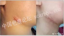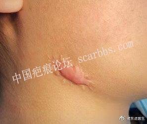 因為是未成年人,且疤痕位于下頜區(qū)(此處有頜下腺),盡管以前的切縫都復(fù)發(fā)了,我們依舊沒有建議做放療。