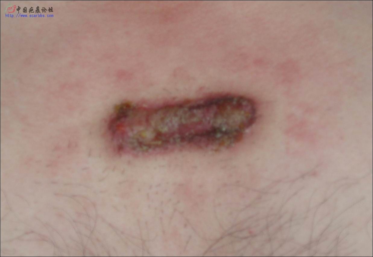 我的疤痕疙瘩在正胸部,2006年7、8月經(jīng)過(guò)兩次注射,后復(fù)發(fā),于2007年5月開(kāi)始尋求鍶90的治療。